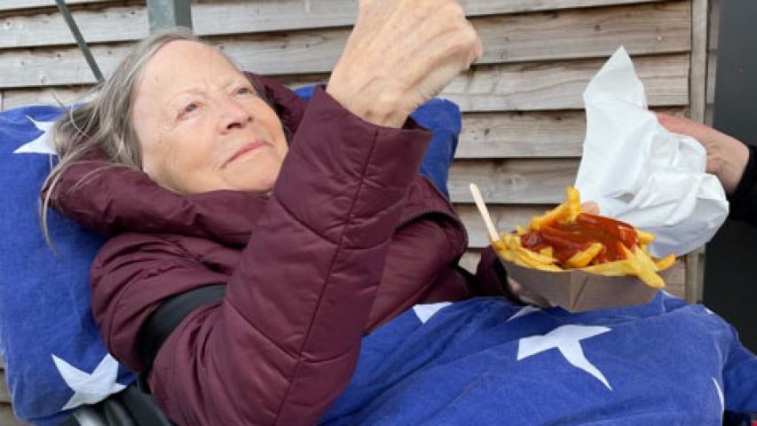 Mit den Fischbrötchen und einem Aal im Gepäck machen wir uns auf den Weg zu unserer „VIP-Location“. Herr Traulsen hat seinen Teil unserer Arbeitsteilung optimal erfüllt und erwartet uns vor Ort. Wir dürfen auf die Terrasse des „Pier-Speicher“, eine tolle Location, direkt mit Blick auf den Hafen, wo wir windgeschützt sitzen können. Das Team vor Ort ist reizend, der Kaffee sehr lecker (Ich komme wieder!) und das Fischbrötchen scheinbar die absolute Erfüllung. Herr Traulsen bleibt, schnackt mit Clara und Lucie über den Wunsch, nach Kappeln zu kommen (was er scheinbar sehr gut verstehen kann), mit Laura und Patrick über den Wünschewagen, Fahrkünste (vermutlich meine) und ich bin ein bisschen begeistert, wie schön dieser Tag bereits ist. Clara macht sich zwischendurch jede Menge Gedanken. Ob Herr Traulsen nicht friert, weil er nur ein Jacket trägt. Ob der Aal, den wir gekauft haben, nicht zu teuer ist. Ob ich wirklich den schweren Rollstuhl schieben kann, weil ich einige Tage vorher gefallen bin und meine Hände etwas lädiert sind. In all dem steckt so was wie eine Unsicherheit, ob sie „diesen ganzen Aufwand wirklich wert ist“ - Lucie bestätigt, dass es für ihre Mutter gar nicht so leicht ist, das alles anzunehmen. Ja, liebe Clara, das warst und bist du, inkl. Fischbrötchen und allem, was dazu gehört! Den Fahrgästen entstehen nie Kosten, weil das, was wir bezahlen, vom ASB übernommen wird – weil es viele Spenderinnen und Spender gibt. Umso schöner, wenn wir, wie in diesem Fall, zum Kaffee eingeladen werden. Danke!